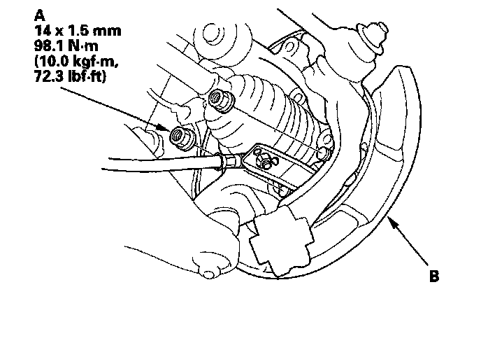 3. Remove the brake caliper bracket mounting bolts (A), and remove the caliper assembly (B) from the knuckle. To prevent damage to the caliper assembly or brake hose, use a short piece of wire to hang the caliper assembly from the undercarriage. Do not twist the brake hose with force.