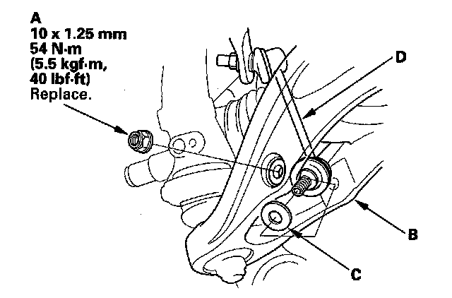 2. Remove the lower arm A mounting nut (B), washers (C), and mounting bolt (D) from the knuckle side.