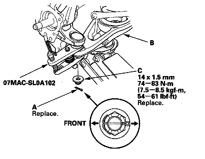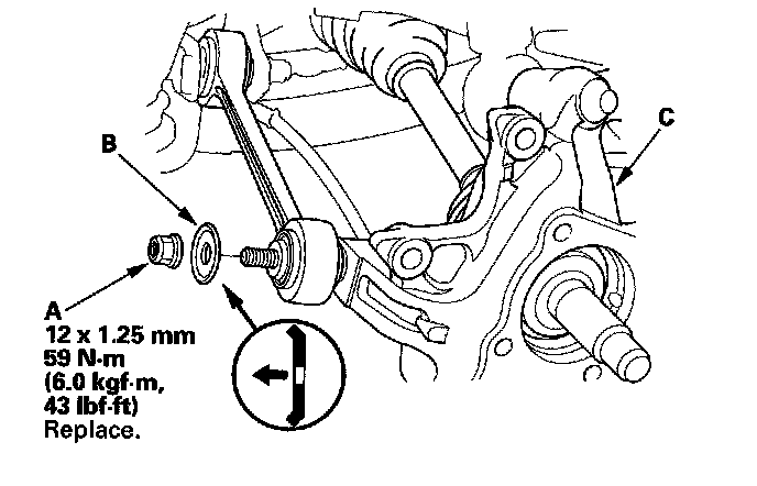 13. Remove the control arm mounting nut (A) and washer (B) from the knuckle (C), then remove the knuckle.