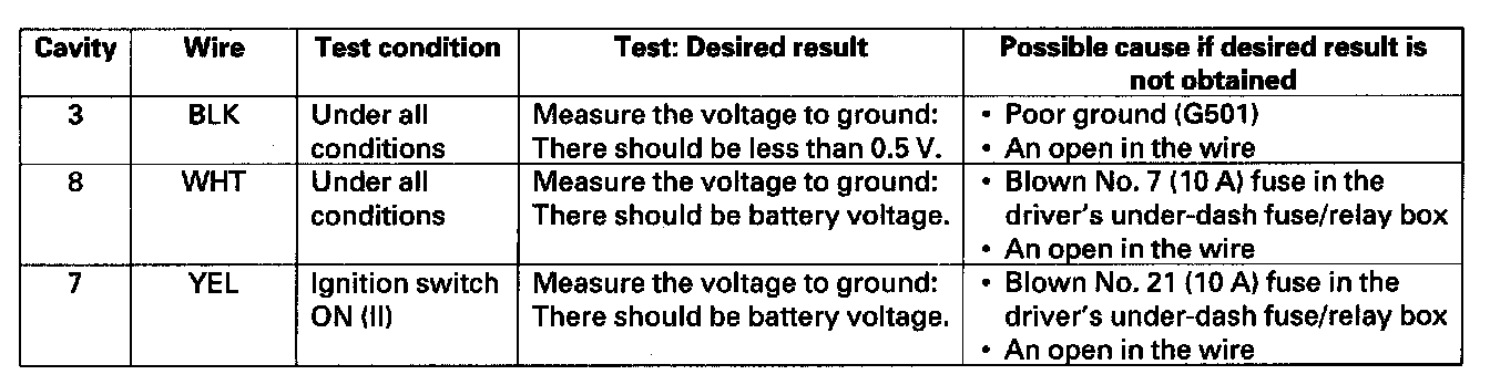 4. Reconnect the connector to the wiper/washer switch, and make these input tests at the connector.