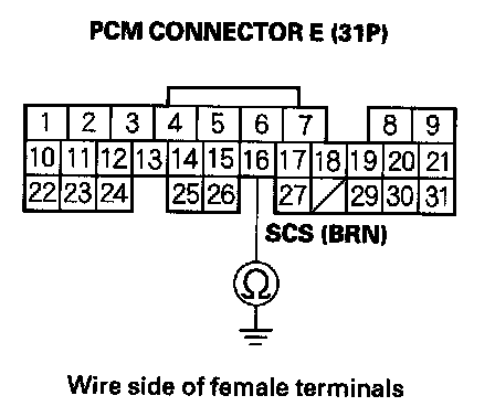 16. Check for continuity between PCM connector terminal E16 and body ground.