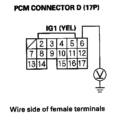 32. Measure voltage between PCM connector terminal D6 and body ground.