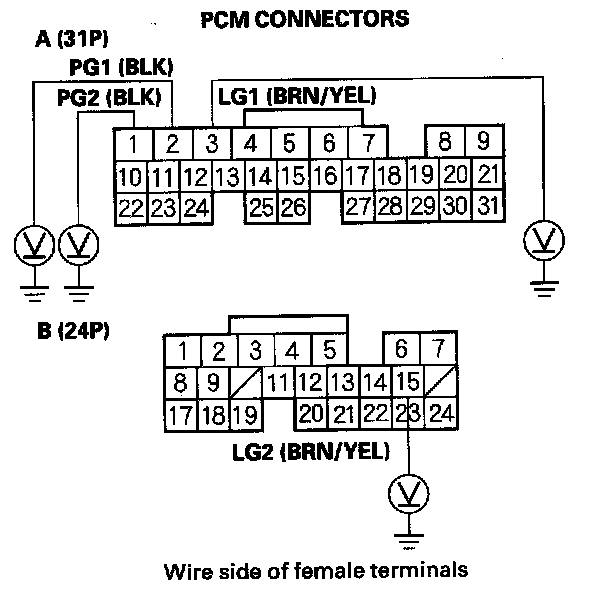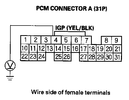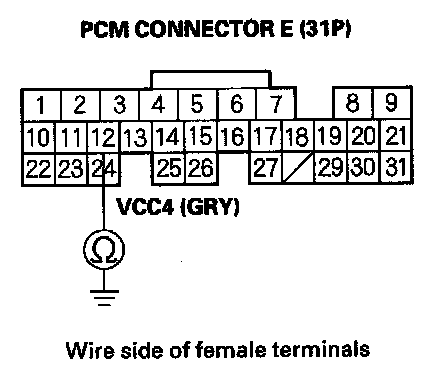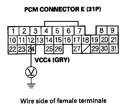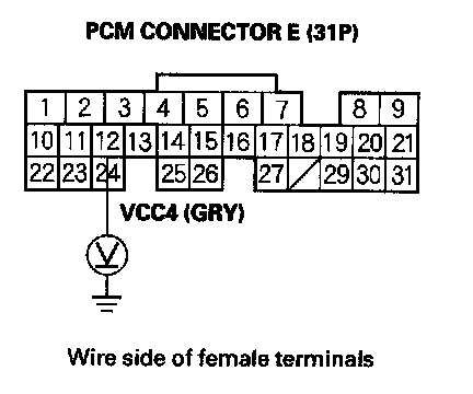 77. Disconnect the connector, from each of the following sensors, one at a time, and measure voltage between body ground and PCM connector terminal E12 with the ignition switch ON (II).
