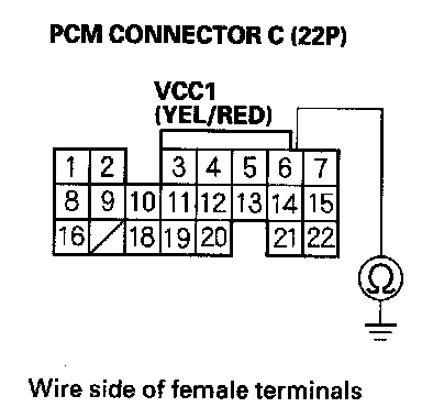 61. Disconnect the connector from each of the following sensors, one at a time, while measuring voltage between body ground and PCM connector terminal C14 with the ignition switch ON (II).