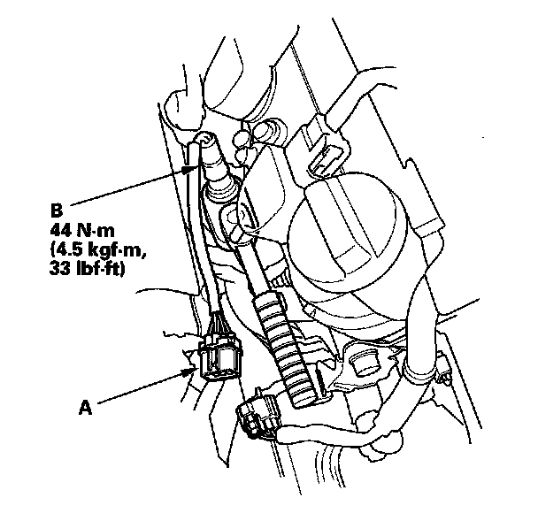 1. Disconnect the front A/F sensor 8P connector (A), then remove the A/F sensor (B) with an O2 sensor socket wrench.