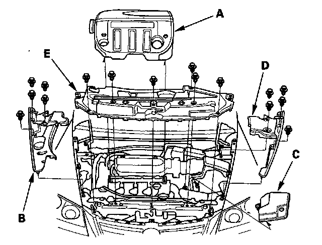 Ignition Coil Removal/Installation1. Remove the engine cover (A), right upper fender trim (B), battery trim (C), left upper fender trim (D), then remove the grille cover (E).