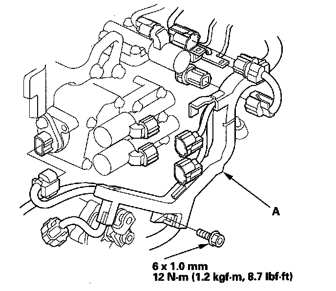 15. Disconnect the connectors from A/T clutch pressure control solenoid valves A and B, the solenoid harness, transmission range switch, ATF temperature sensor, output shaft (countershaft) speed sensor, input shaft (mainshaft) speed sensor, 3rd clutch transmission fluid pressure switch, and 4th clutch transmission fluid pressure switch.