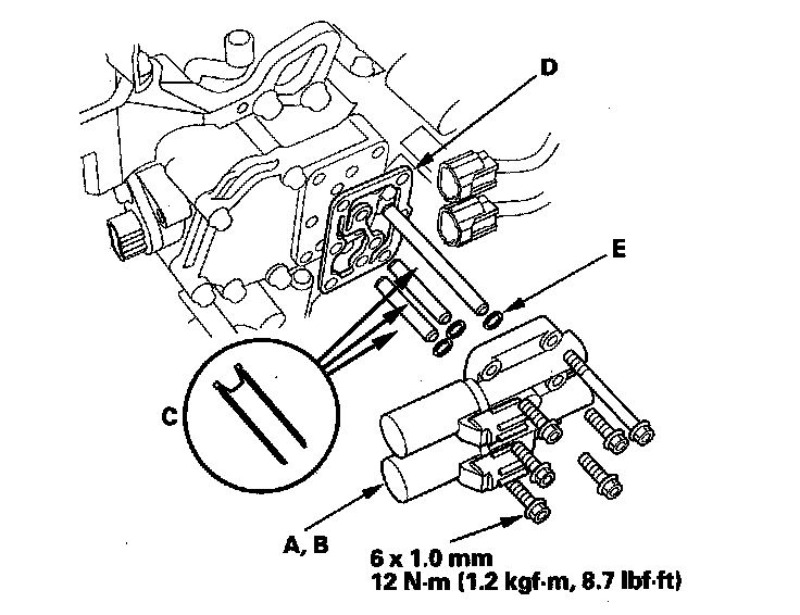 17. Remove A/T clutch pressure control solenoid valves A and B, ATF pipes (C), gasket (D), and O-rings (E).