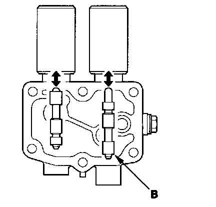 20. Disconnect one of the battery terminals, and check the valve movement at the fluid passage in the valve body mounting surface. If the valve binds or moves sluggishly, or if the solenoid valve does not operate, replace A/T clutch pressure control solenoid valves A and B.
