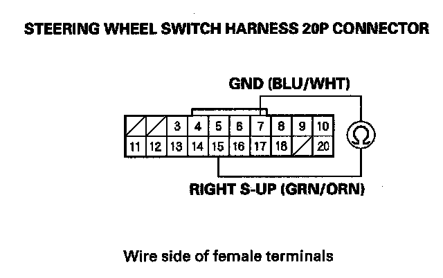 2. Check for continuity between the steering wheel switch harness 20P connector terminals No. 15 and No. 7 while pressing the paddle shifter + (upshift switch) and when the shifter is released.