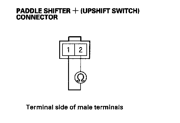 4. Check for continuity between the paddle shifter + (upshift switch) connector terminals No. 1 and No. 2 while pressing the shifter and when the shifter is released.
