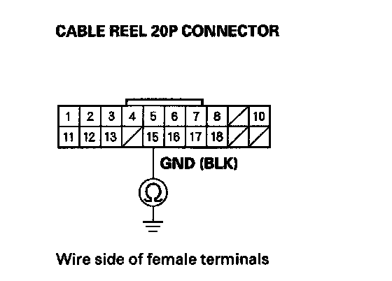 6. Check for continuity between the cable reel 20P connector terminal No. 15 and body ground.