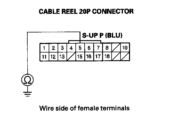 7. Check for continuity between the cable reel 20P connector terminal No. 5 and body ground.