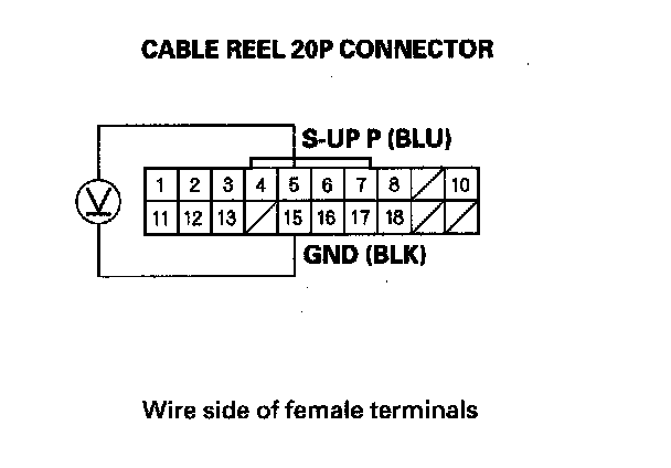 9. Measure the voltage between the cable reel 20P connector terminals No. 5 and No. 15.