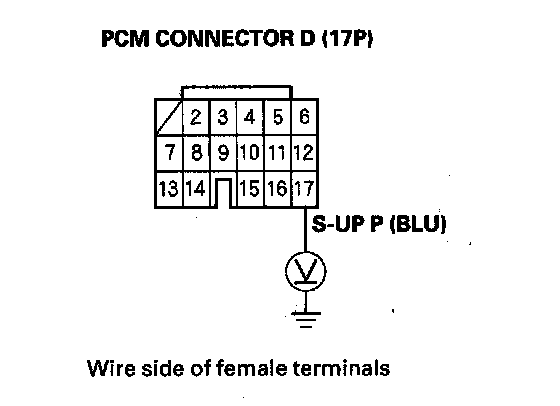 10. Measure the voltage between the PCM connector terminal D17 and body ground.