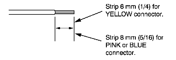 7. If you are using a yellow splice connector, strip about 6 mm (1/4 inch) of insulation off the ends of both wires. If you are using a pink or blue splice connector, strip off about 8 mm (5/16 inch) of insulation.