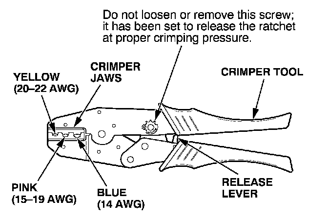 8. Put the splice connector in the proper size slot in the Crimper Tool, slide it to one end (where the flare begins), and close the crimper handles far enough to hold it in place. To release the ratchet mechanism at any point after the first click, squeeze the handles slightly and push the release lever, then let the handles open.