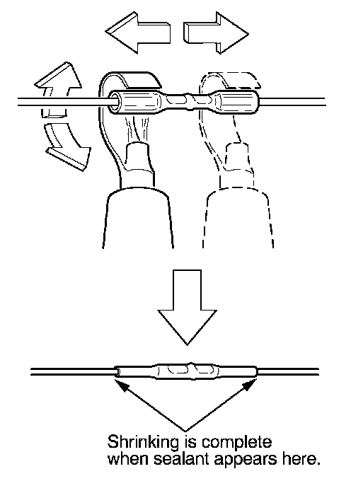 13. Plug in the heat gun, and turn it on. Start at the middle of the splice connector, and move the gun toward the ends as the tube shrinks. Apply heat evenly by rotating the curved heat spreader around the splice connector. Shrinking is complete when a small amount of sealant appears at each end of the tube.