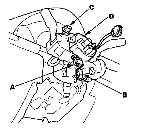 8. Disconnect the dashboard wire harness A 4P connector (A) from the cable reel 4P connector (B), then disconnect the dashboard wire harness B ('05 model) or the dashboard wire harness A ('06-08 models) 20P connector (C) from the cable reel (D).