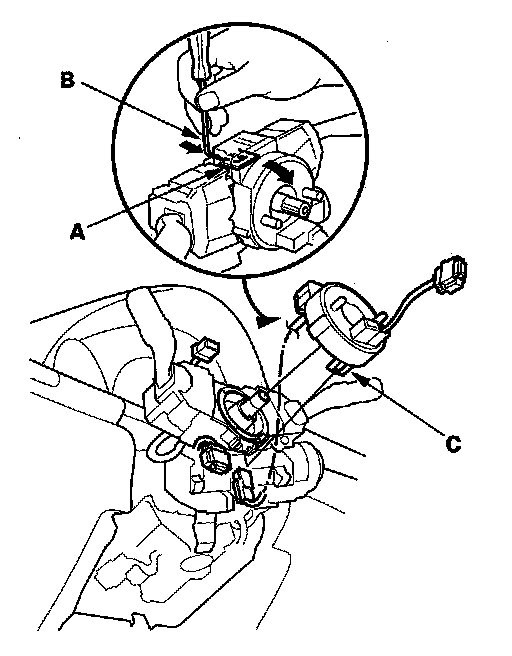 9. Release the lock tab (A) under the cable reel connector with a 90° hook shaped tool (B). Slide the tool below the cable reel connector just above the lock tab. Release the lower lock tab (C), and slide the cable reel off the column.