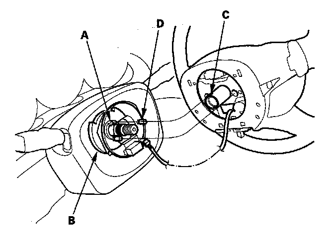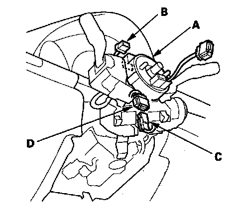 7. Position the two tabs (A) of the turn signal cancelling sleeve (B) as shown, and install the steering wheel on the steering column shaft, making sure the steering wheel hub (C) engages the pins (D) of the cable reel and tabs of the turn signal cancelling sleeve. Do not tap on the steering wheel or steering column shaft when installing the steering wheel.