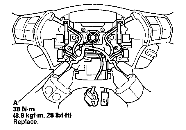 8. Install and torque a new steering wheel nut (A), then reconnect the connector.