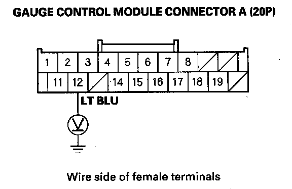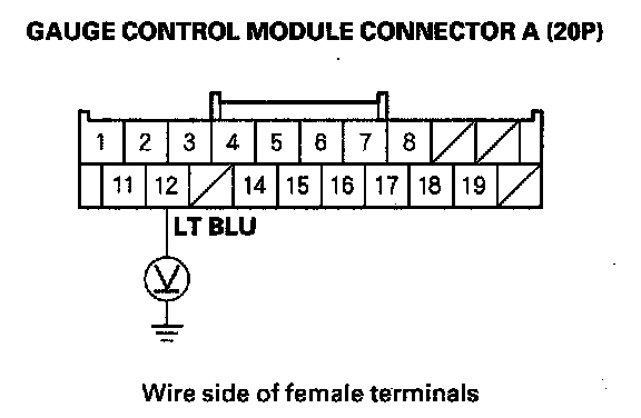 4. Measure the voltage between the No. 12 terminal of gauge control module connector A (20P) and body ground within the first 6 seconds after turning the ignition switch ON (II). There should be about 1.0 V for 6 seconds and then about 11 V.