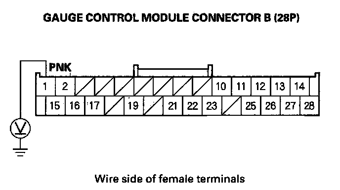 12. Measure the voltage between the No. 1 terminal of gauge control module connector B (28P) and body ground. There should be battery voltage.