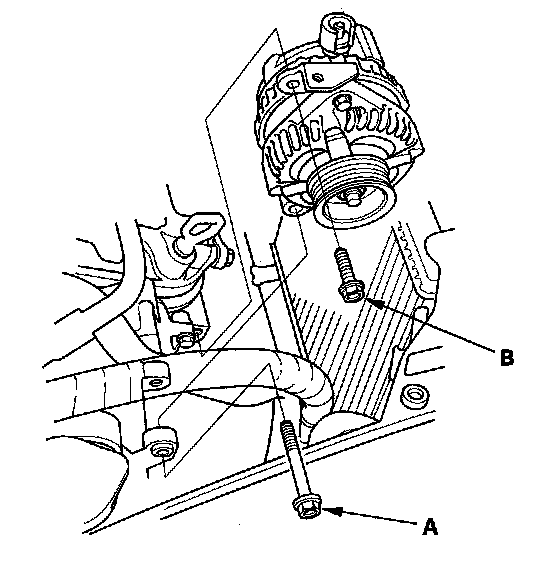 14. Remove the mounting bolt (A) and alternator bracket mounting bolt (B), then remove the alternator.
