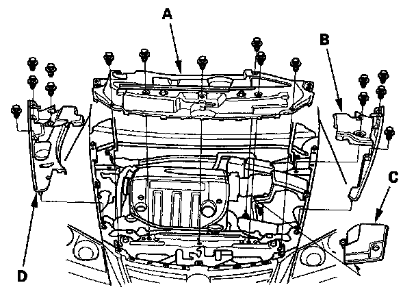 13. Install the upper grille cover (A), then install the left upper fender trim (B), battery trim (C), and right upper fender trim (D).
