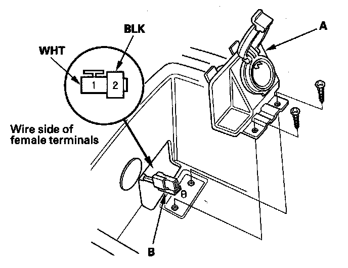 3. Inspect the 2P connector (B) terminals to be sure they are all making good contact.