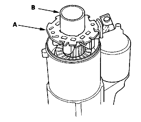 19. If the starter drive gear (B) is worn or damaged, replace the overrunning clutch assembly; the gear is not available separately. Check the condition of the idler gear and drive plate ring gear to see if the starter drive gear teeth are damaged.