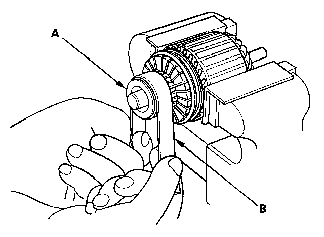 7. Check the commutator (A) surface. If the surface is dirty or burnt, resurface it with an emery cloth or a lathe to the specifications in step 8, or recondition with #500 or #600 sandpaper (B).