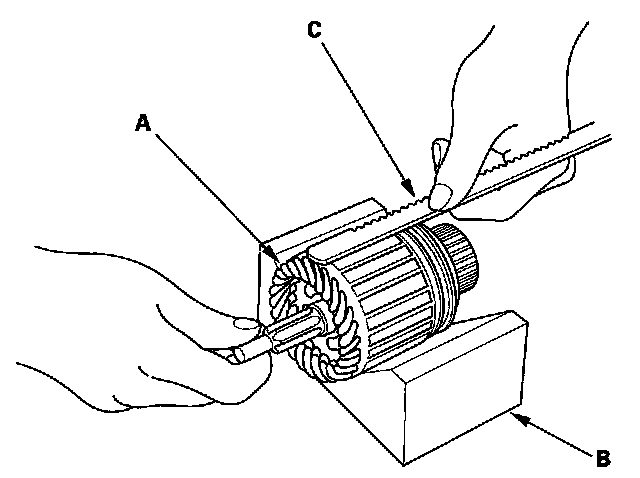 12. Place the armature (A) on an armature tester (B). Hold a hacksaw blade (C) on the armature core. If the blade is attached to the core or vibrates while the core is turned, the armature is shorted. Replace the armature.