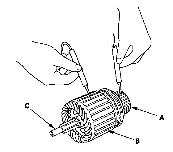 13. Use an ohmmeter to check for continuity between the commutator (A) and the armature coil core (B), and between the commutator and the armature shaft (C). If there is continuity, replace the armature.