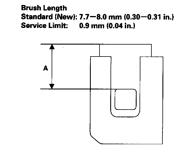 14. Measure the brush length (A). If it is shorter than the service limit, replace the brush holder assembly.