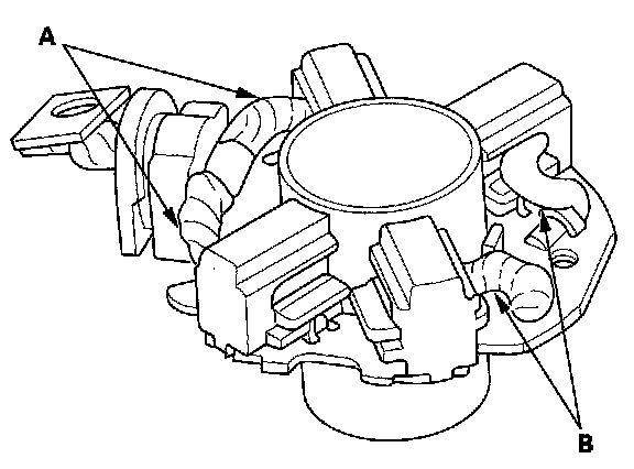 15. Check for continuity between the (+) brush (A) and (-) brush (B). If there is continuity, replace the brush holder assembly.