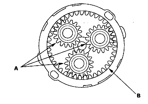 16. Check the planetary gears (A) and ring gear (B). Replace them if they are worn or damaged.