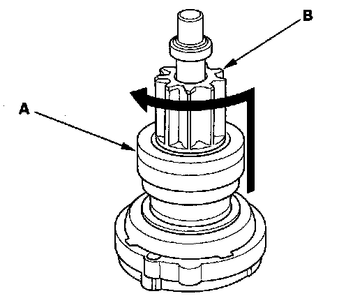 18. Rotate the overrunning clutch (A) in both directions. It should lock and move upward in one direction and rotate Smoothly in the other direction. If it does not lock in either direction, or if it locks both directions, then replace it.