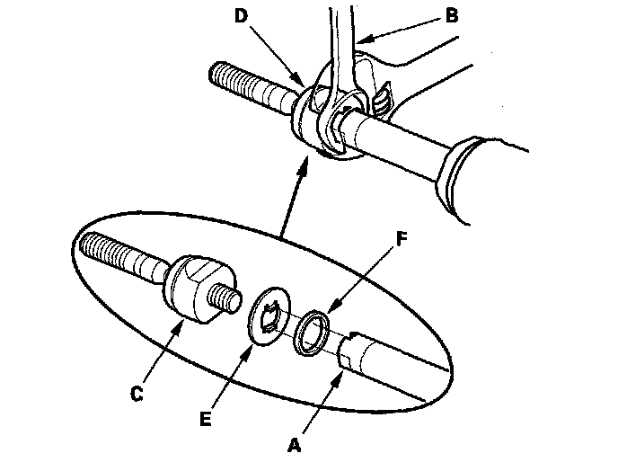 5. Remove the lock washer (E) and rubber stop (F).
