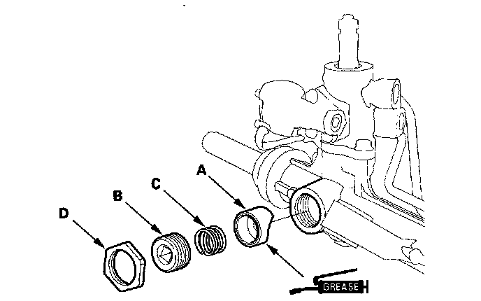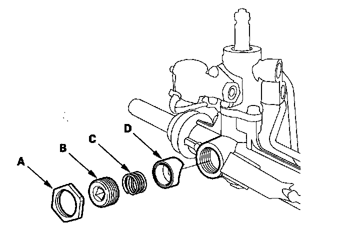 73. Apply new sealant (Three Bond 1141) all the way around the first three threads of the rack guide screw (B), then install the spring (C), rack guide screw, and locknut (D).