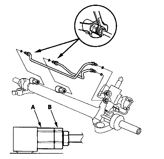NOTE: Use a second wrench when loosening the cylinder lines to avoid damage to the fittings on the steering gearbox. Do not loosen the A and B connectors.