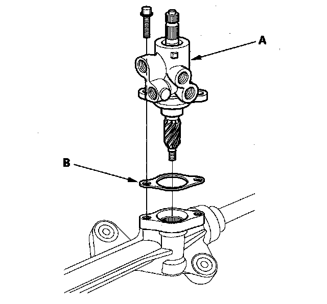 12. Remove the flange bolt, the valve body unit (A), and gasket (B) from the gearbox. Check that the valve turns smoothly by turning the pinion shaft. If any play or roughness is felt, replace the valve body unit with a new part if necessary. Do not try to disassemble the valve body unit.