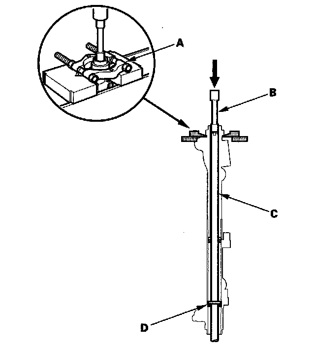 18. Set the steering gearbox in a press so the gearbox housing side points upward, then press the cylinder end seal (D) and steering rack out of the gearbox. Hold the steering rack to keep it from falling when pressed clear. Be careful not to damage the inner surface of the cylinder housing with the tool.