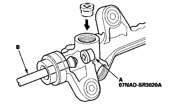 6. Loosen the locknut (A), then remove the rack guide screw (B).