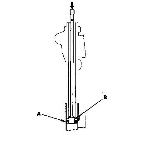 20. Place the steering gearbox in a press, then remove the cylinder end seal (A) and backup ring (B) from the gearbox by pressing on the 24" long, 3/8" drive extension.