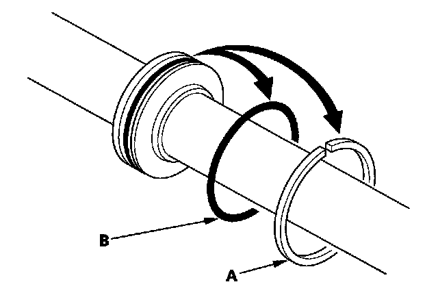 52. Install the new backup ring (A) on the steering rack, then place the backup ring and cylinder end seal (B) against the piston (C).