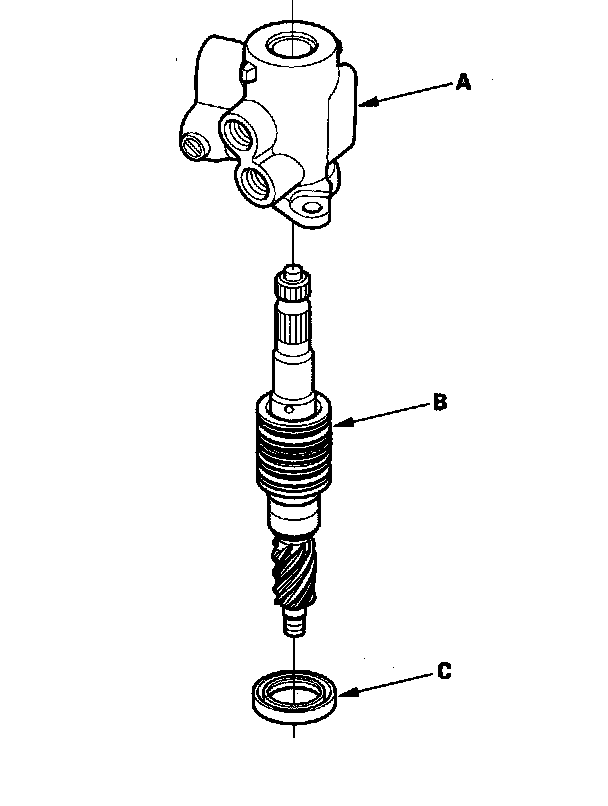 23. Separate the valve housing (A) from the pinion shaft/valve (B) using a press, then remove the pinion oil seal (C).
