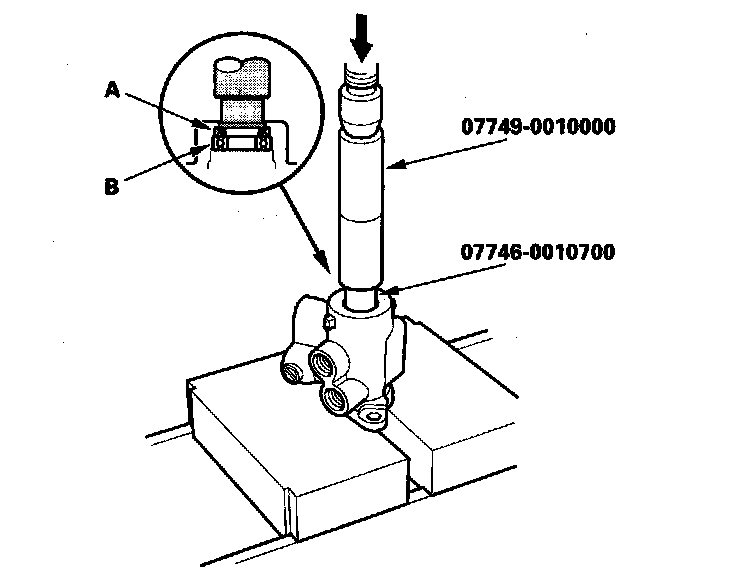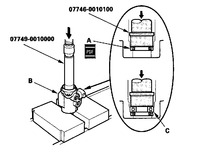 36. Apply power steering fluid to the seal ring lip of the new valve oil seal (A), then install the seal in the valve housing (B) using a hydraulic press, driver and attachment, 32 x 35 mm. Install the seal with its grooved side facing the tool.