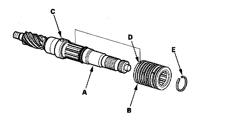 35. Apply power steering fluid to the surface of the pinion shaft (A). Slide the sleeve (B) onto the pinion shaft by aligning the locating pin (C) on the inside of the sleeve with the cutout (D) in the shaft. Then install the new snap ring (E) securely in the pinion shaft groove. Be careful not to damage the valve seal ring when inserting the sleeve.